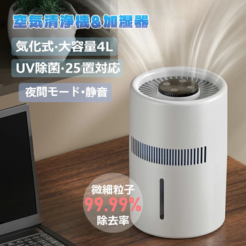 加湿器 気化式 4L 空気清浄 大容量 花粉 除菌 大範囲加湿 おしゃれ 上から給水 水漏れしない 2段階風量設定 お手入れ簡単 水量確認可能 省エネ 卓上 usb