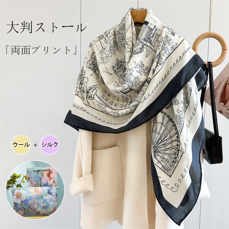 ウール シルク ストール ショール レディース 大人 高級 スカーフ ペイズリ バンダナ柄 モノトーン・バイカラー 大判サイズ おしゃれでエレガント 20代 30代 40代 秋冬 防寒 暖かい 柔らかい 起毛 ひざ掛け 母の日 敬老の日 誕生日ギフトに最適 旅行時も活躍