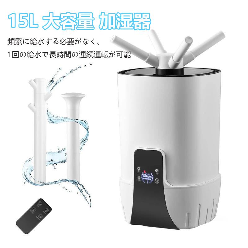 商品説明文:\潤い豊かな空間を実現する★大容量加湿器で快適な生活を!/この15Lの超音波式加湿器は、業務用としても家庭用としても幅広くお使いいただけます。特に上から給水できる設計は便利で、手間いらずでいつでも簡単に水を補充可能です。静音設計で運転中も気にならず、寝室やオフィスでの使用に最適。最大1500ml/hの噴霧量で、乾燥する季節に欠かせないアイテムです。