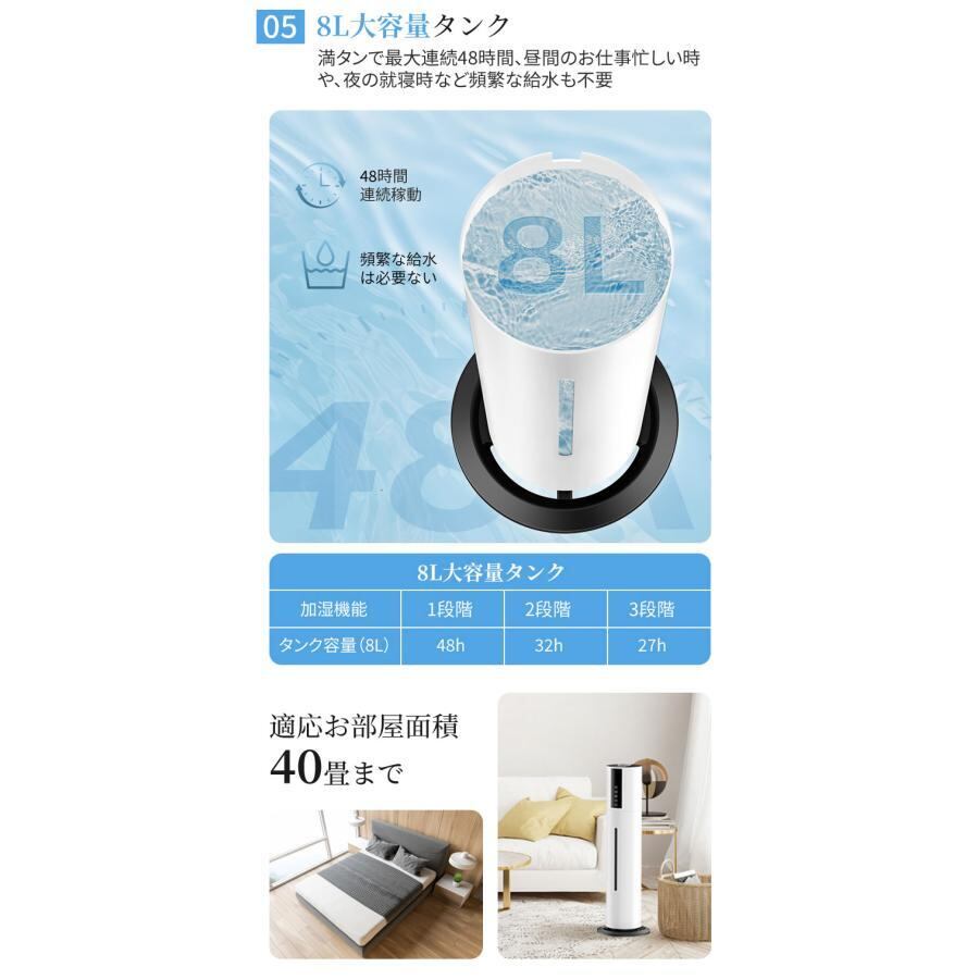 加湿器 大容量 UV除菌&湿度設定 8L 40畳 イオン発生 空気清浄機 超音波加湿器 次亜塩素酸水対応 吹出し口360°回転 3段階噴霧量調節 上から給水 恒湿 睡眠モード 長時間連続加湿 おしゃれ アロマ オフィス タイマー 静音