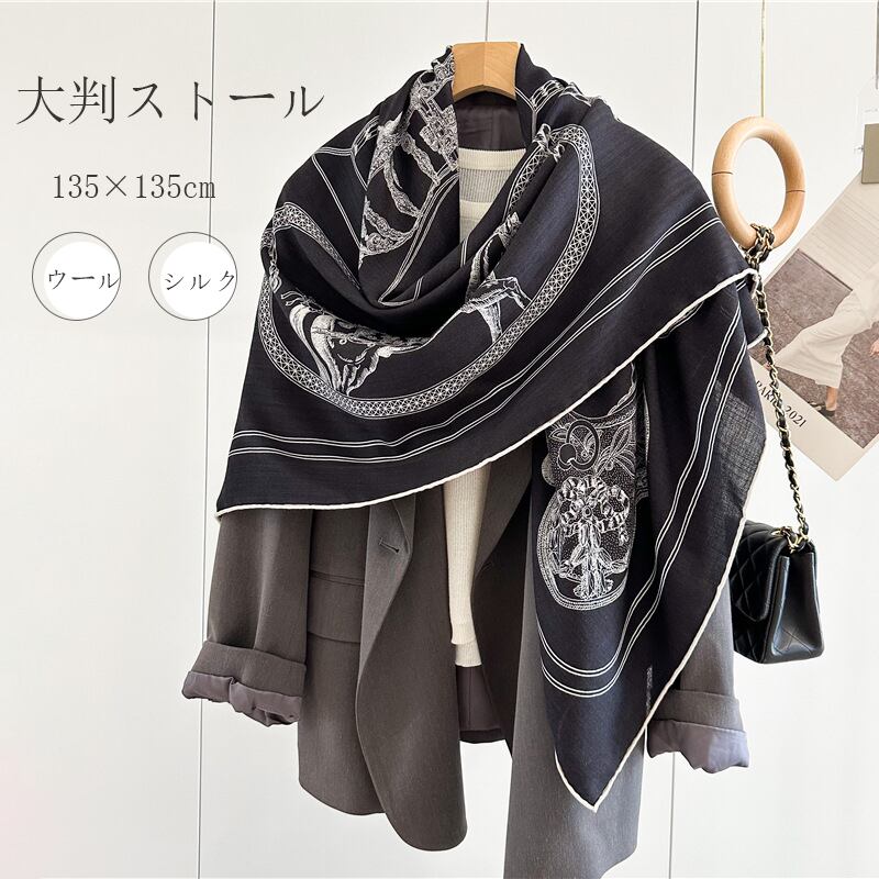 新品「両面プリント」ウール シルク 秋冬 ストール レディース 大人 高級 モノトーン・バイカラー 大判サイズ 起毛 厚手 オシャレエレガント 着物用 持ち運び便利 防寒暖かい ひざ掛け 羽織る 年中使える 20代 30代 40代 母の日 敬老の日 誕生日ギフト最適